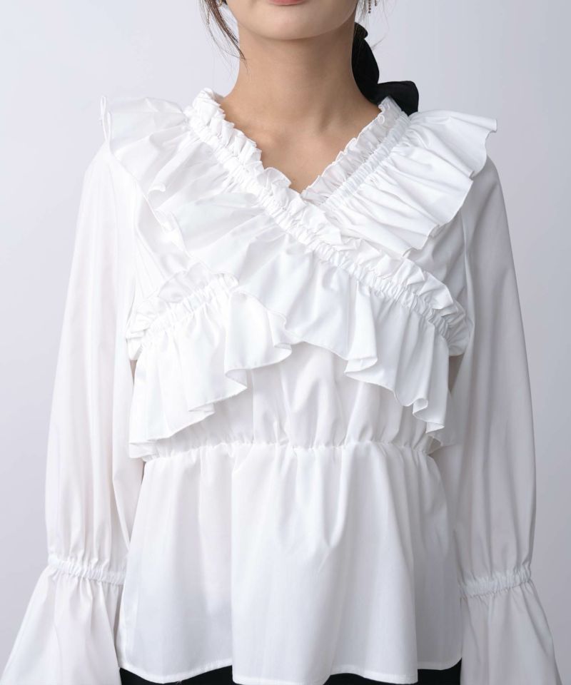 ふんわりと広がる贅沢フリルに、ウエストと袖に入ったゴムギャザーで、より女性らしいシルエットに。