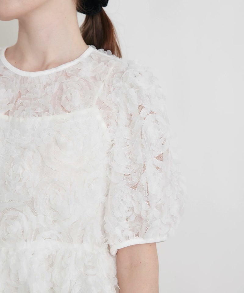 たっぷりのチュール生地に立体的なフラワーデザインを施した、着るだけで心がときめく一枚です。