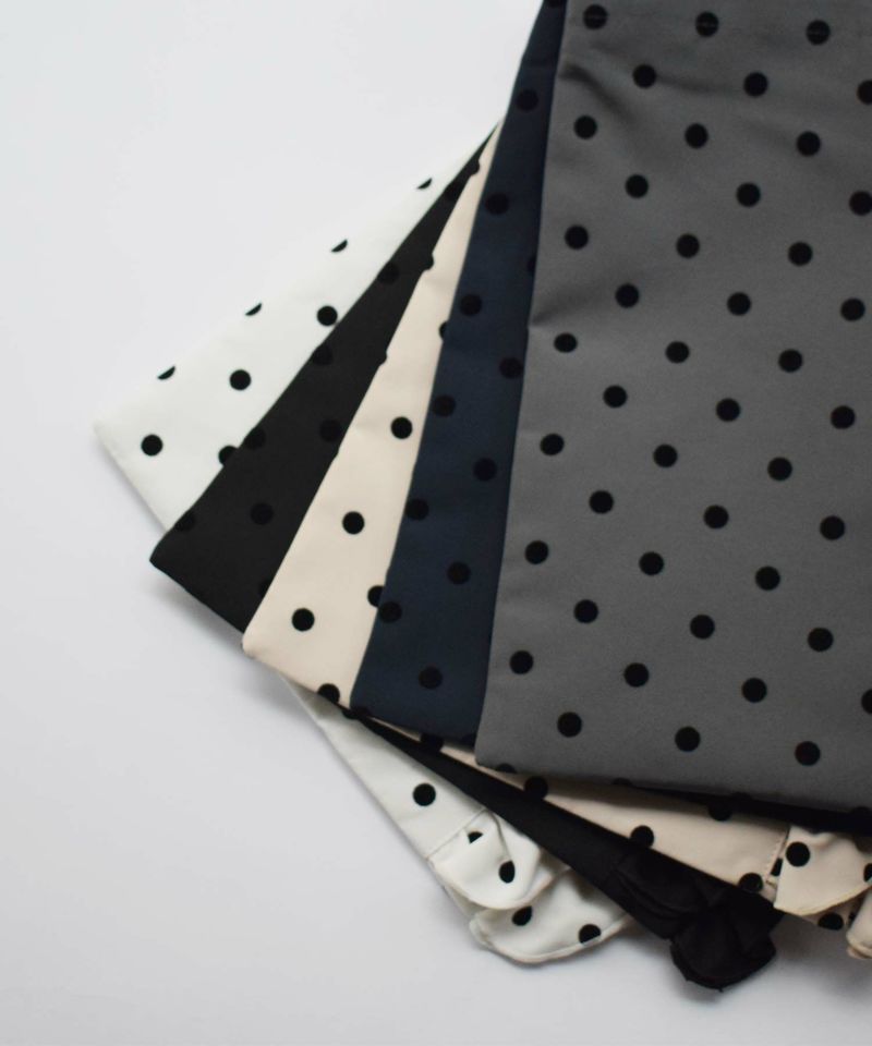 | 素材 | 本体: ポリエステル100% フロック部分: ナイロン100% 裏地: ポリエステル100% パイピング布: ポリエステル80%, コットン20% |