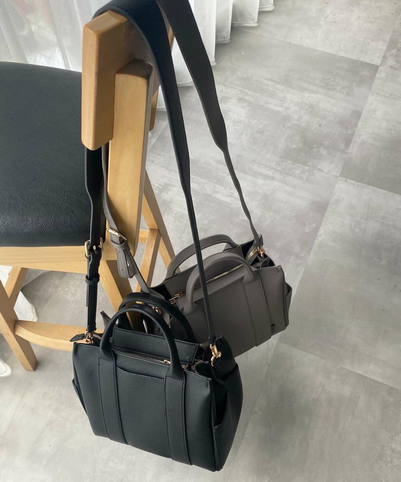 内側は中仕切りがあり収納しやすく、口元ファスナー仕様・ショルダー付きで斜め掛けもOK