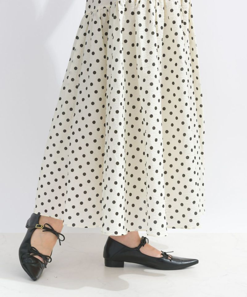 たっぷりのドット柄で、コーデのアクセントにも最適なロマンティックなスカートになっています。