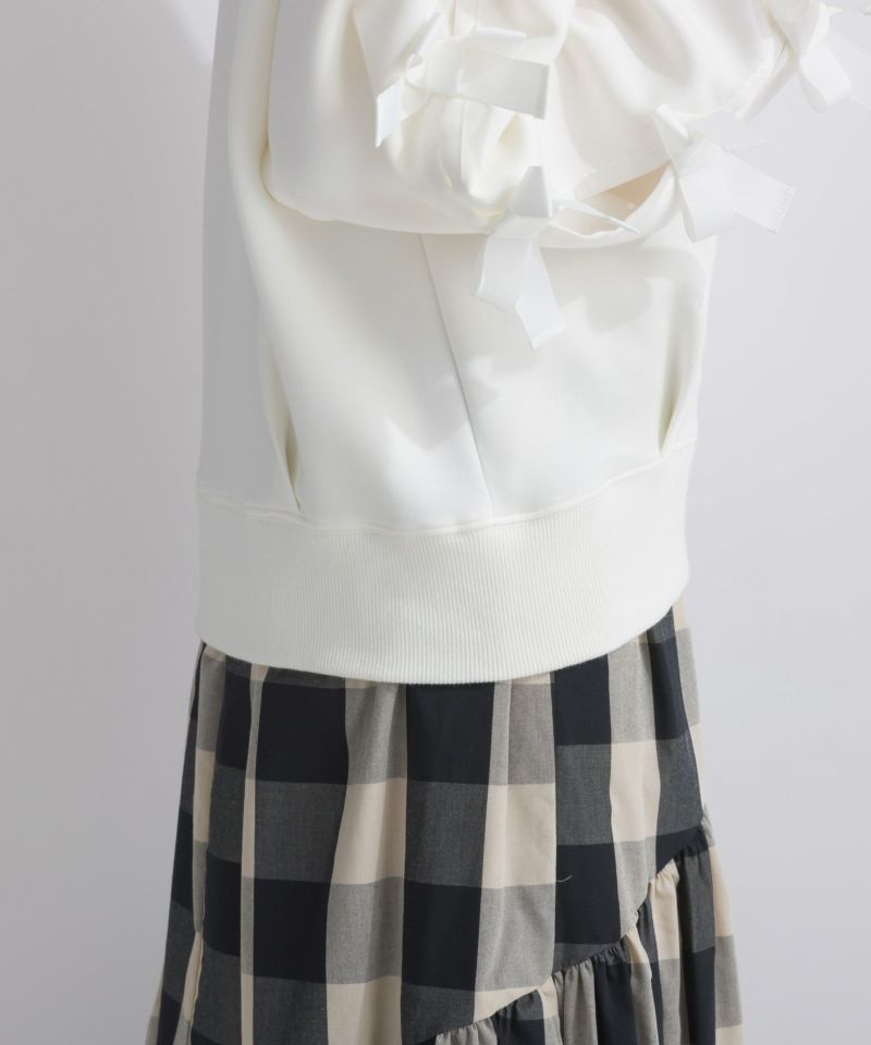 左右の袖部分に均等に施されたリボンが華やかでフェミニンな印象に。