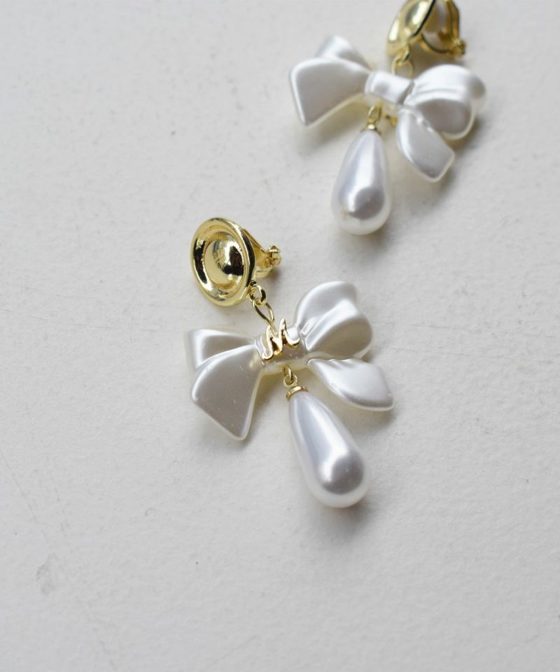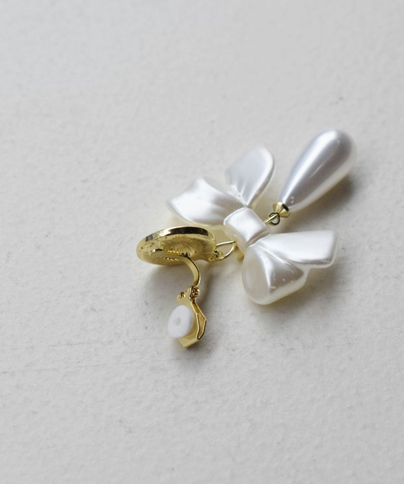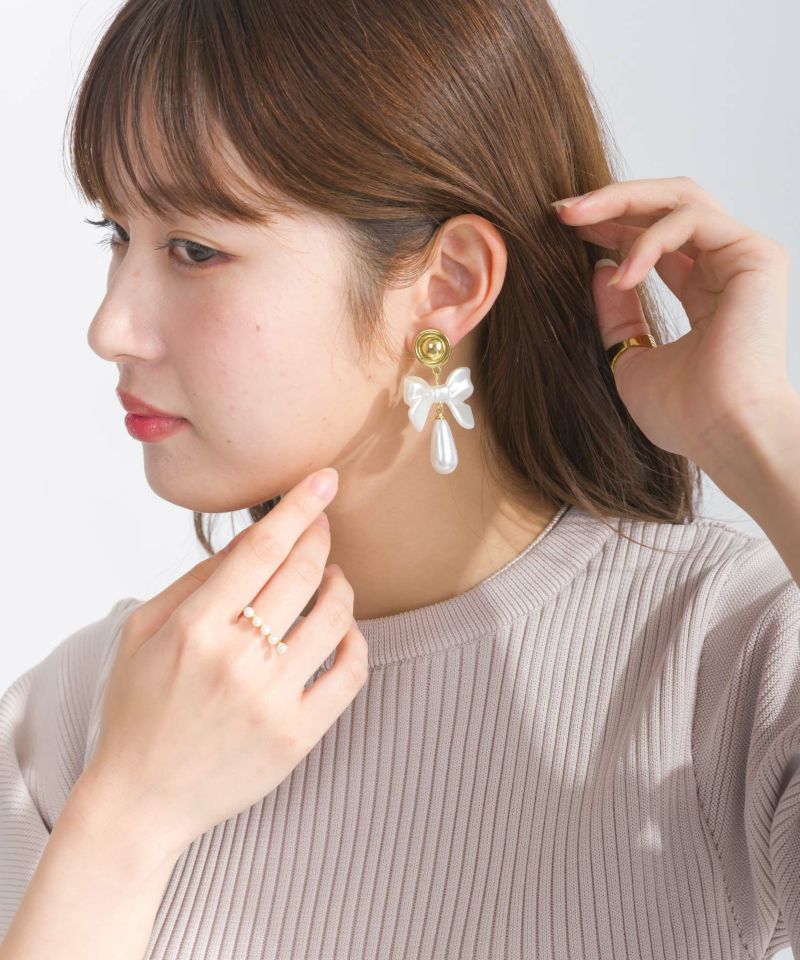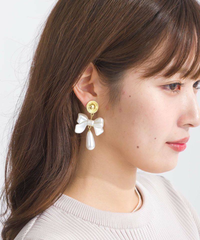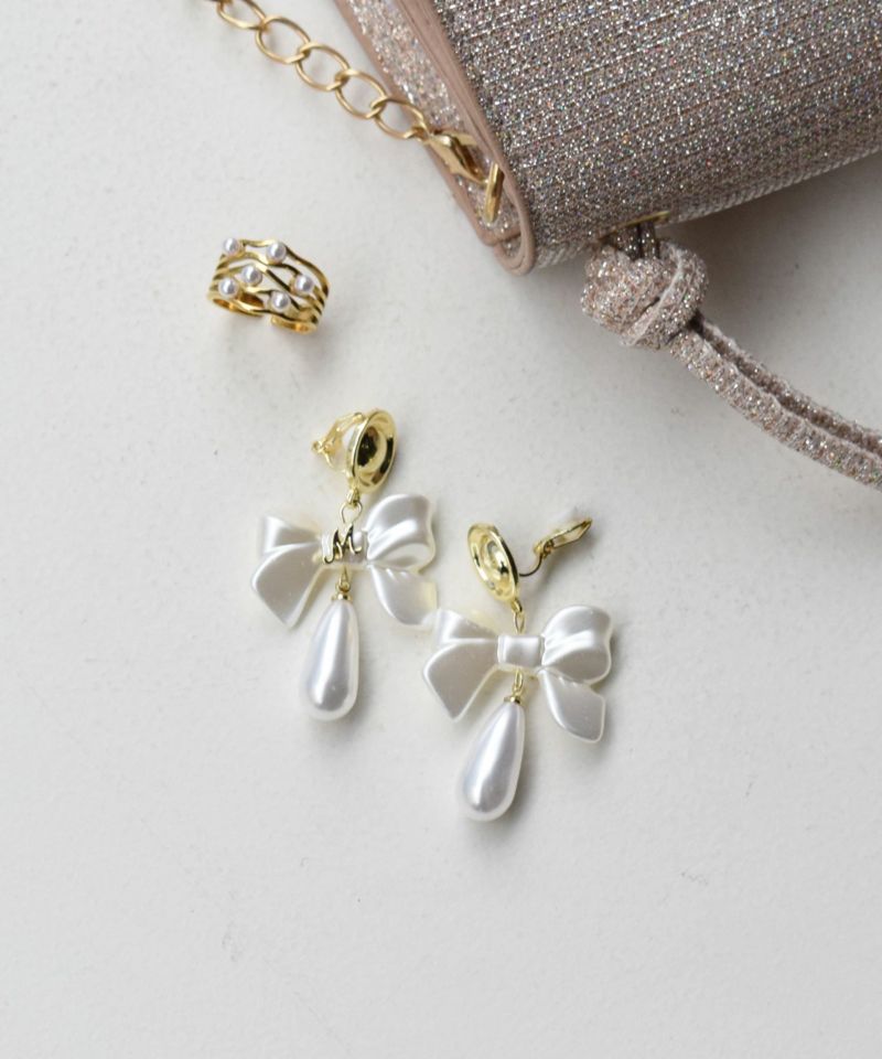 ゴールド金具とリボンモチーフにパール調のドロップ型パーツが付いたデザイン