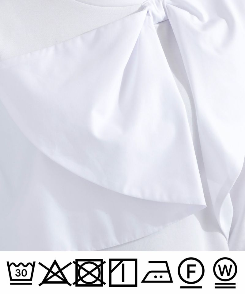 シンプルなロングTシャツに布帛生地のリボンを大胆に配し、