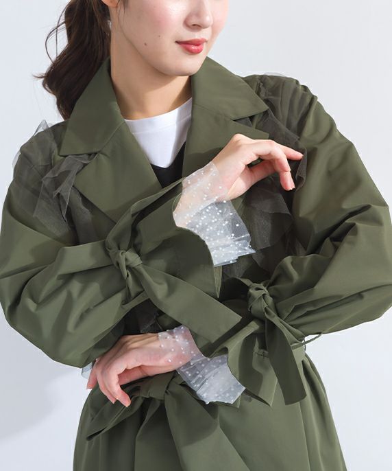 付属のウエストリボンを締めて、より女性らしいメリハリを出した着こなしも素敵です。