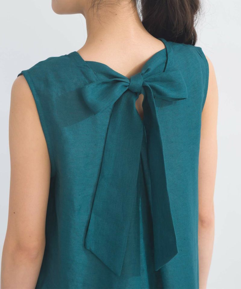 フロントはノーカラーですっきり、バックにはリボンを配しアクセントをプラス。