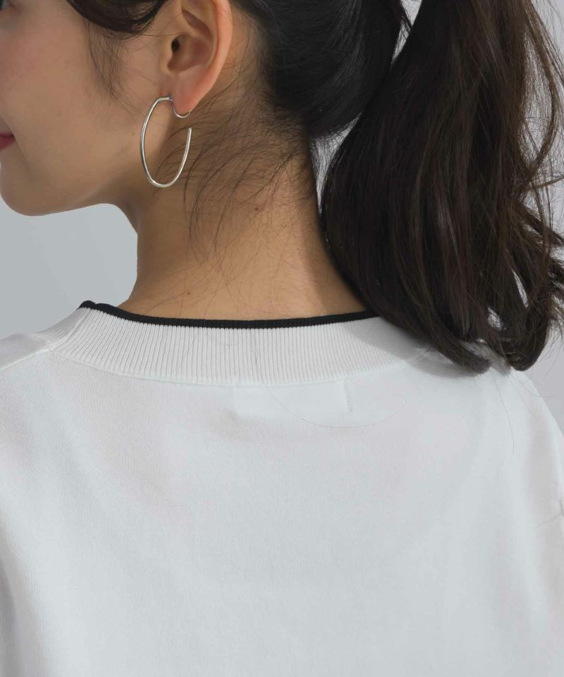襟ぐりや袖口、裾のリブ編みがさりげないアクセントとなり、
