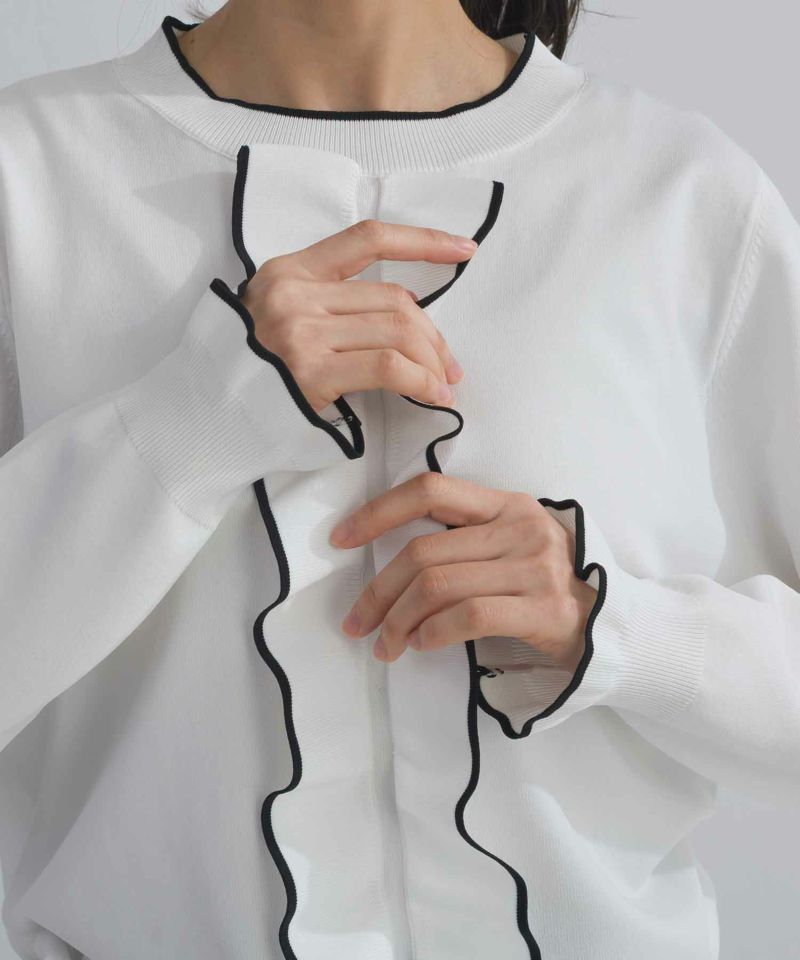 フロントと袖口に施されたフリルデザインが、フェミニンで華やかな印象を与えます。