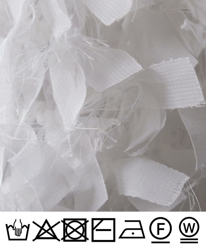 カジュアルなアイテムながらもリボンフリンジを全体に施す事で、フェミニンで表情豊かなデザインに。