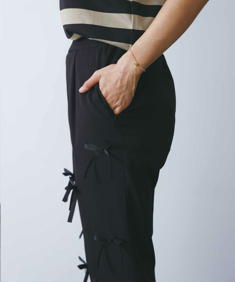 キレイめのテーパードシルエットに、前のみグログランリボンが付いています。