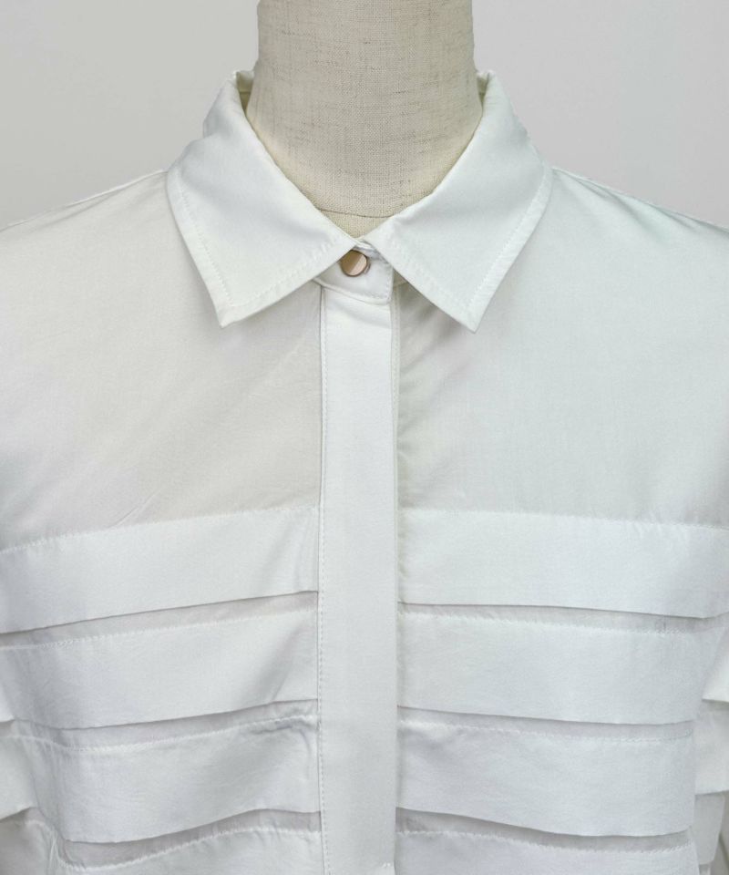 身頃から袖のタックへとつながるプリーツが新鮮で、特徴的な陰影と動きを生み出します。