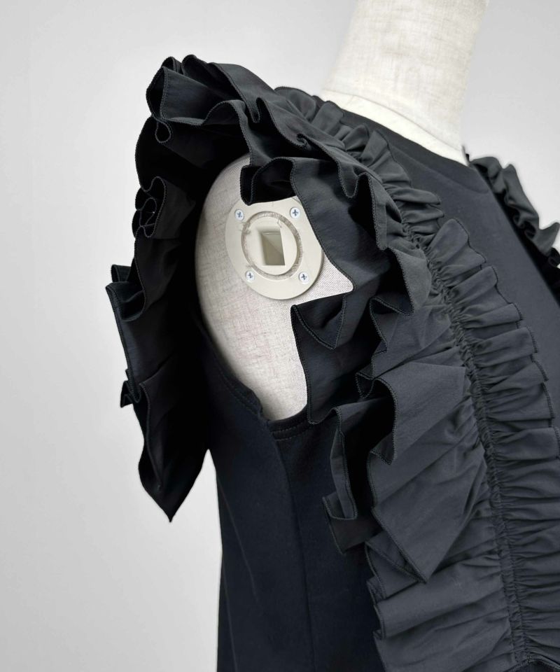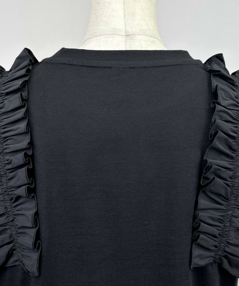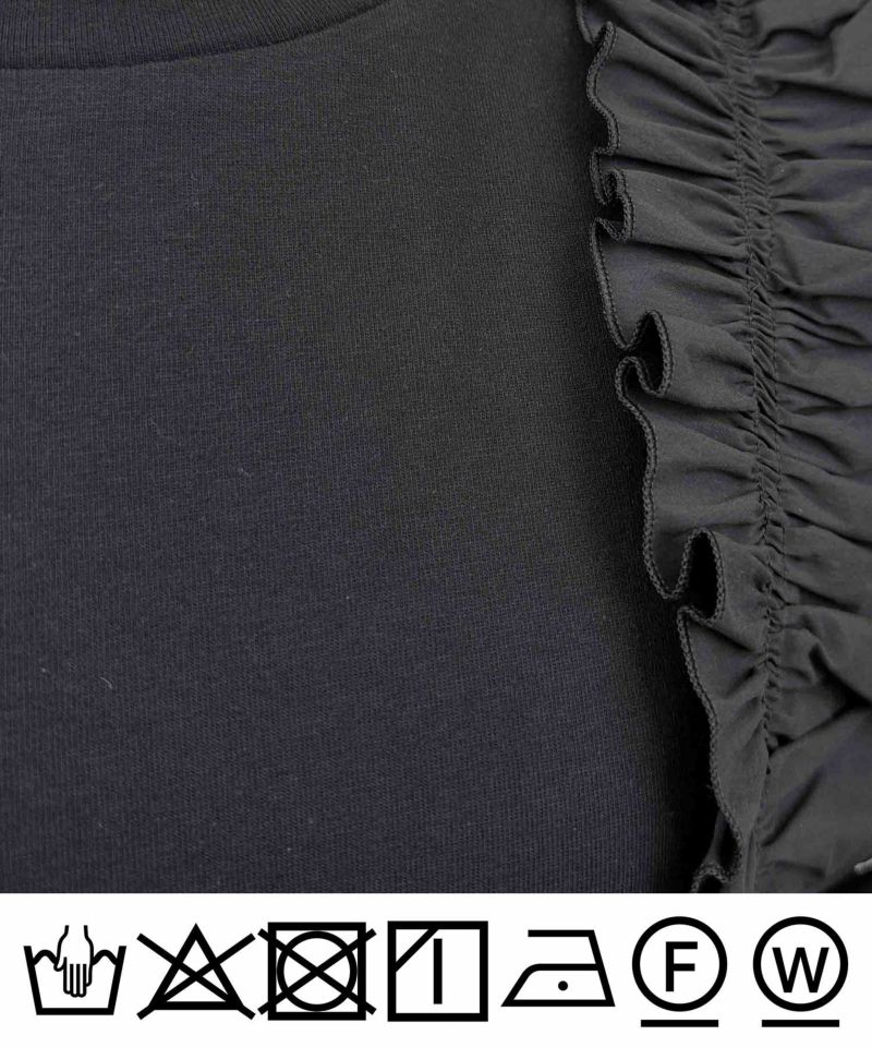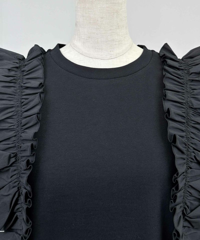 身頃には透けにくくコンパクトな表面感が特徴の綿100%天竺、フリルにはストレッチブロードを使用。