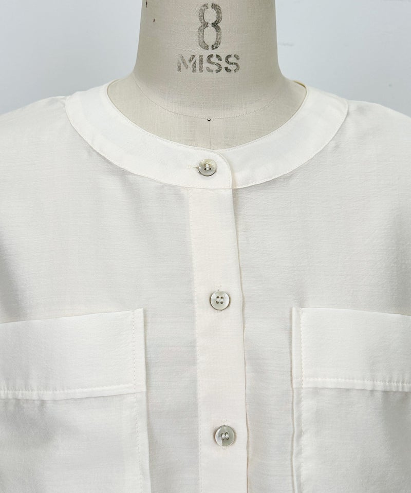 バンドカラーとショート丈のバランスが、すっきりとした着こなしを演出し、