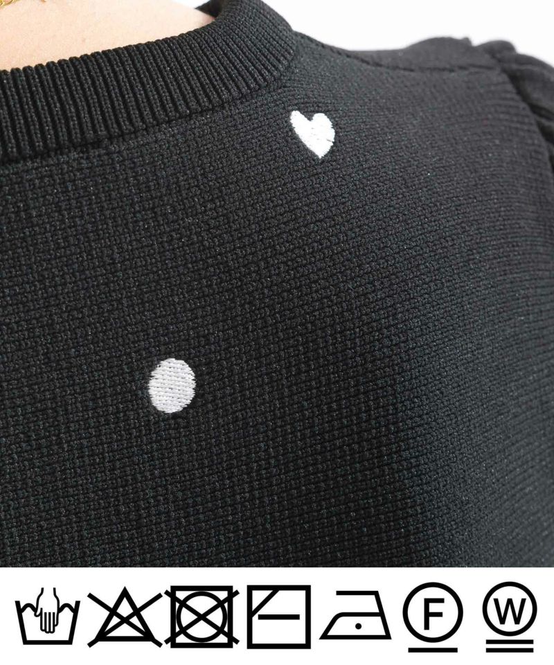 また、フロント左裾とバック右肩の2か所のみハート刺繍を忍ばせ、