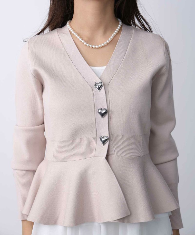 襟ぐりのVラインや切り替え下にはボタンを付けない事で、