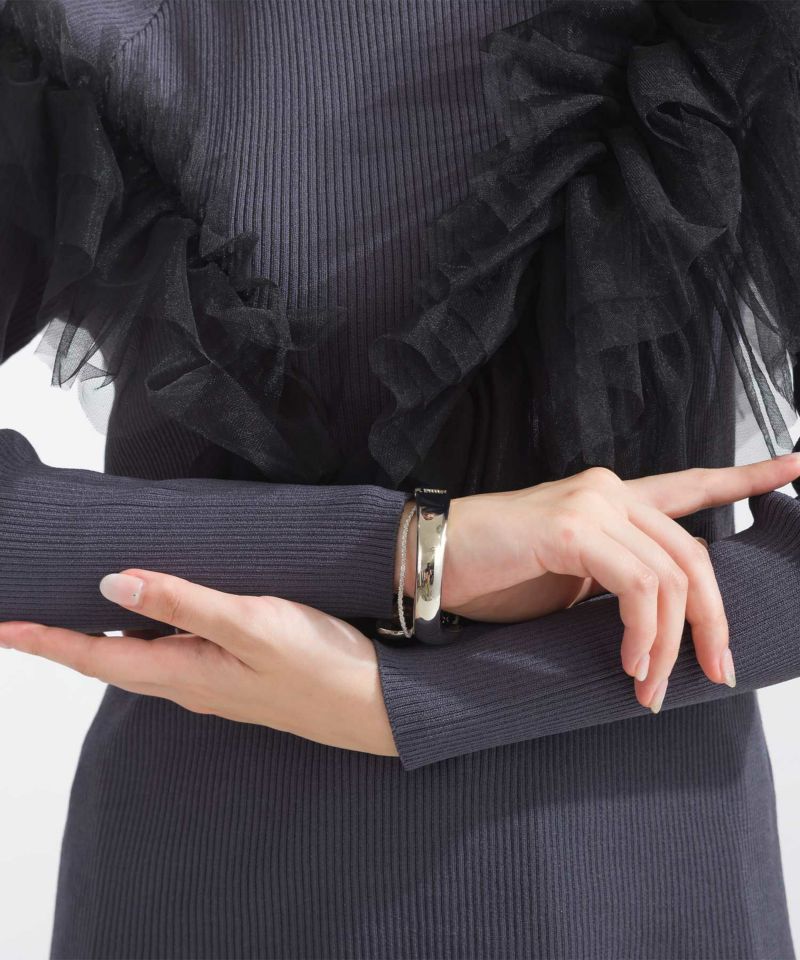 シンプルなリブニットにランダムなチュールフリルを配し、