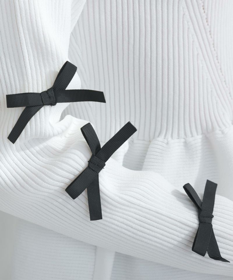袖部分には可愛いグログランリボンがあしらわれており、女性らしさを引き立ててくれます。