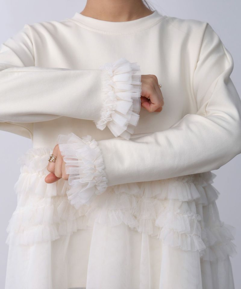 目を惹くのが、身頃と袖口にたっぷり重ねたチュールフリル。