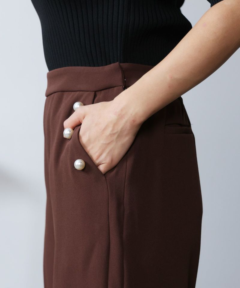 サイドに付いたパールが上品できれいめなワイドパンツ