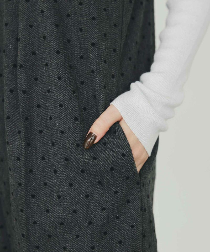 ほんのりあたたかみのあるウール混のへリンボーン生地に、さりげなく散りばめられた小さなハート柄のフロッキー加工。
