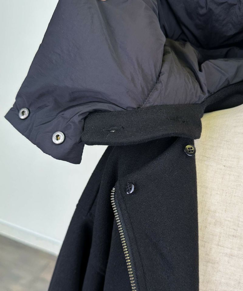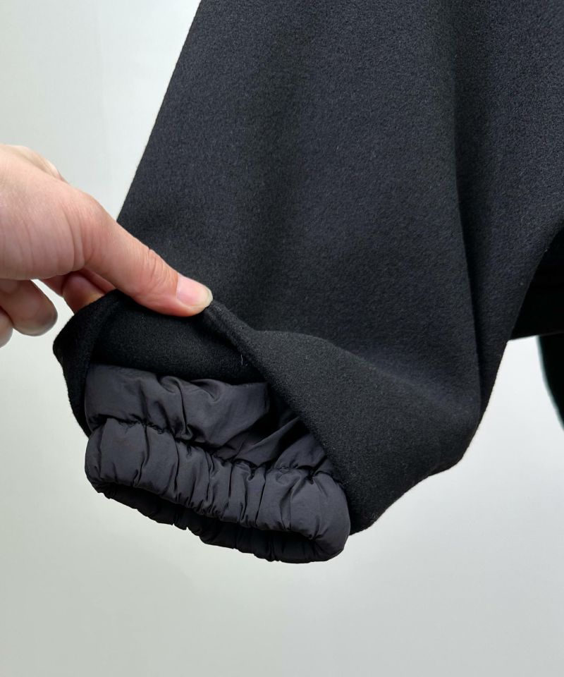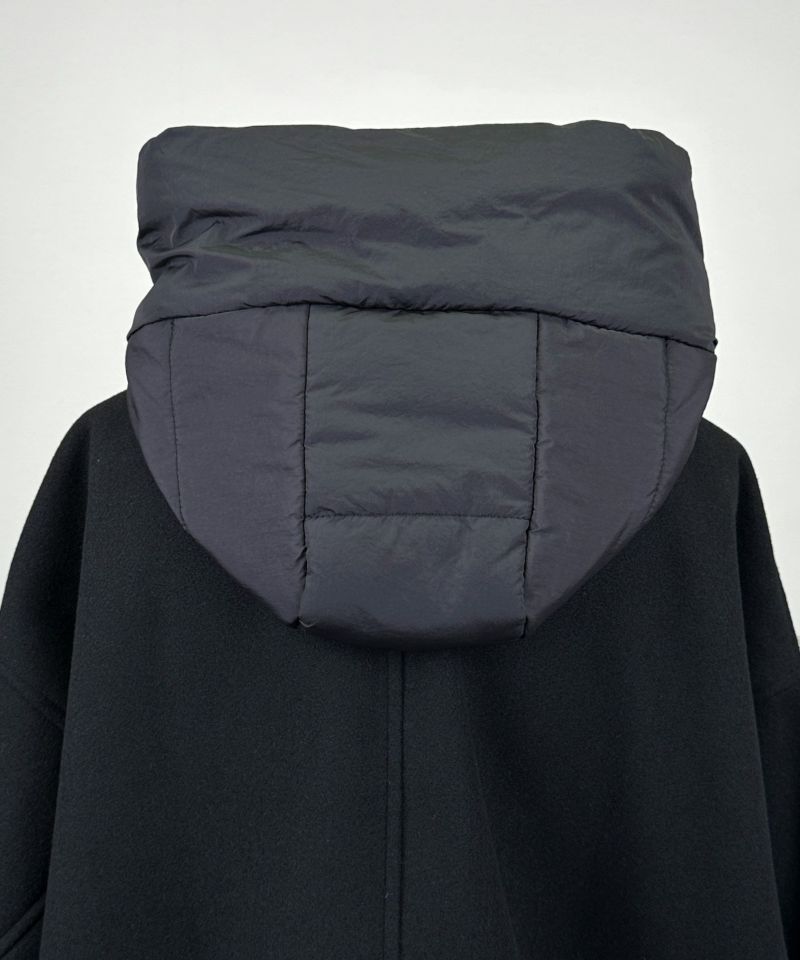 袖口とボリューミーなフードには、中綿入りの異素材を使い、さりげないアクセントとぬくもりをプラス。