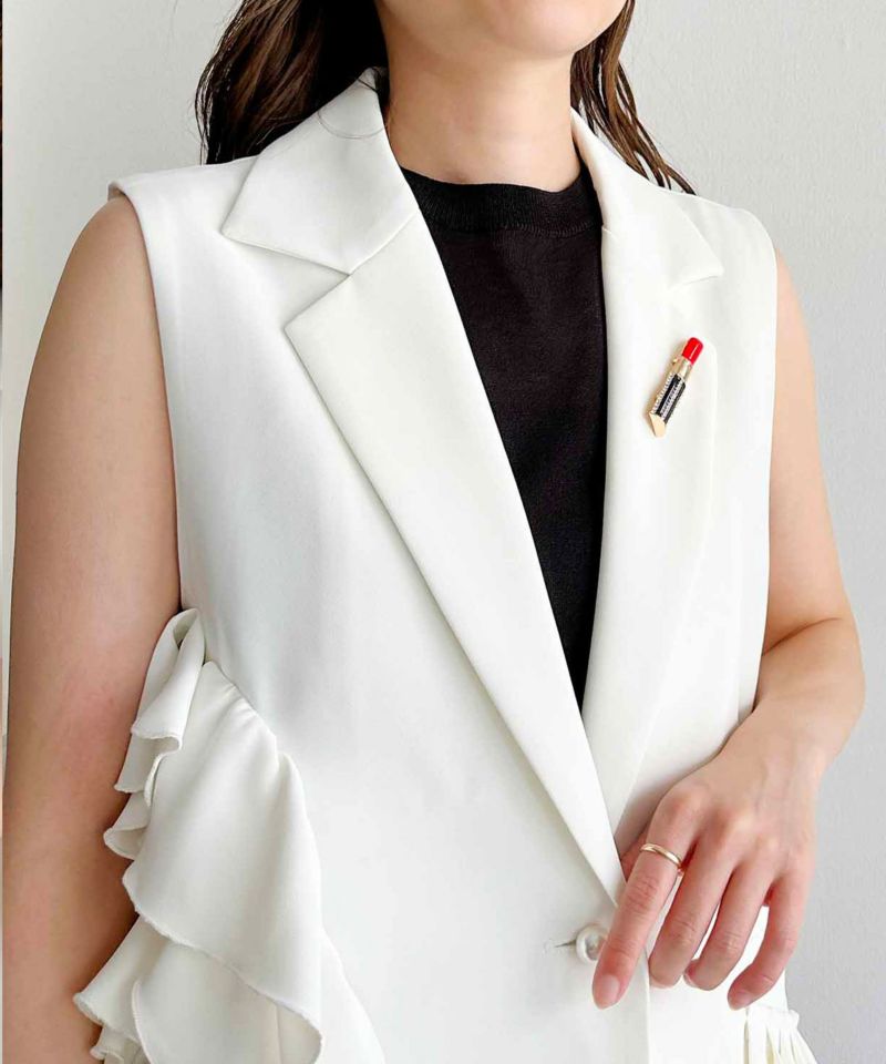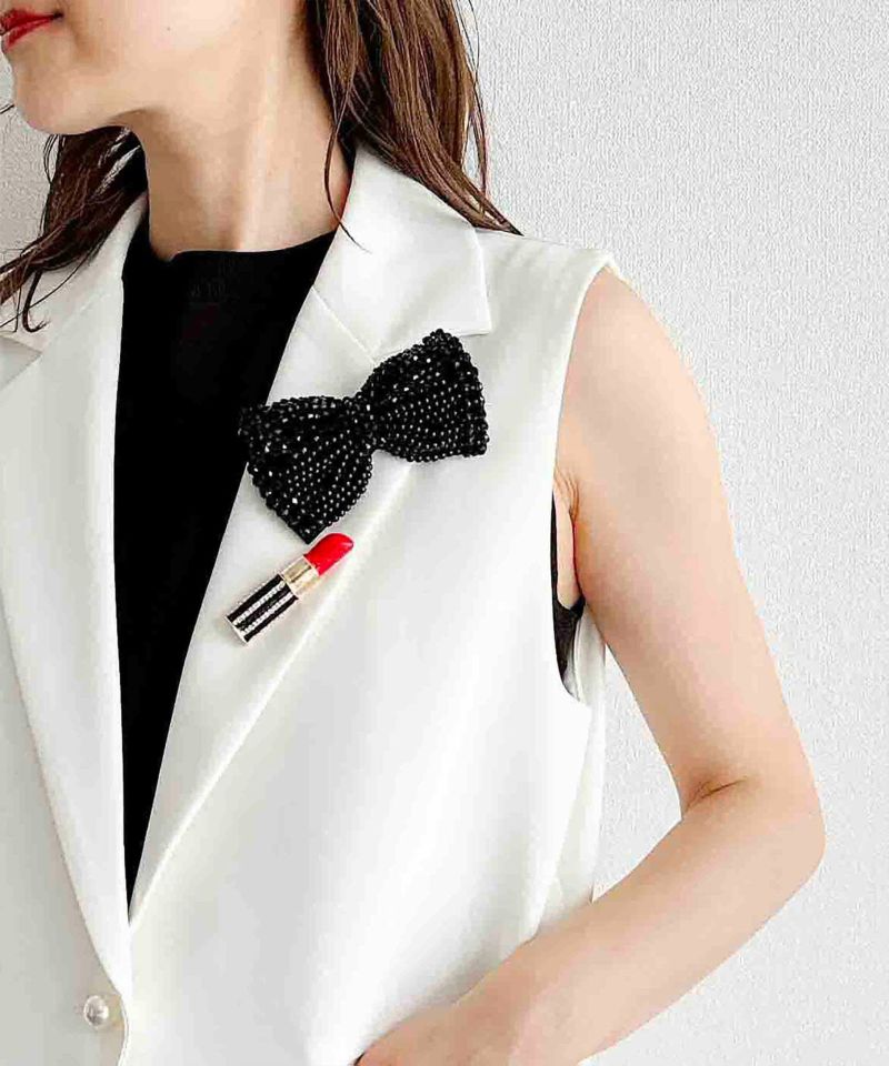 トップスの襟元やジャケットのラペル、バッグや帽子・スカーフなどの小物にも。