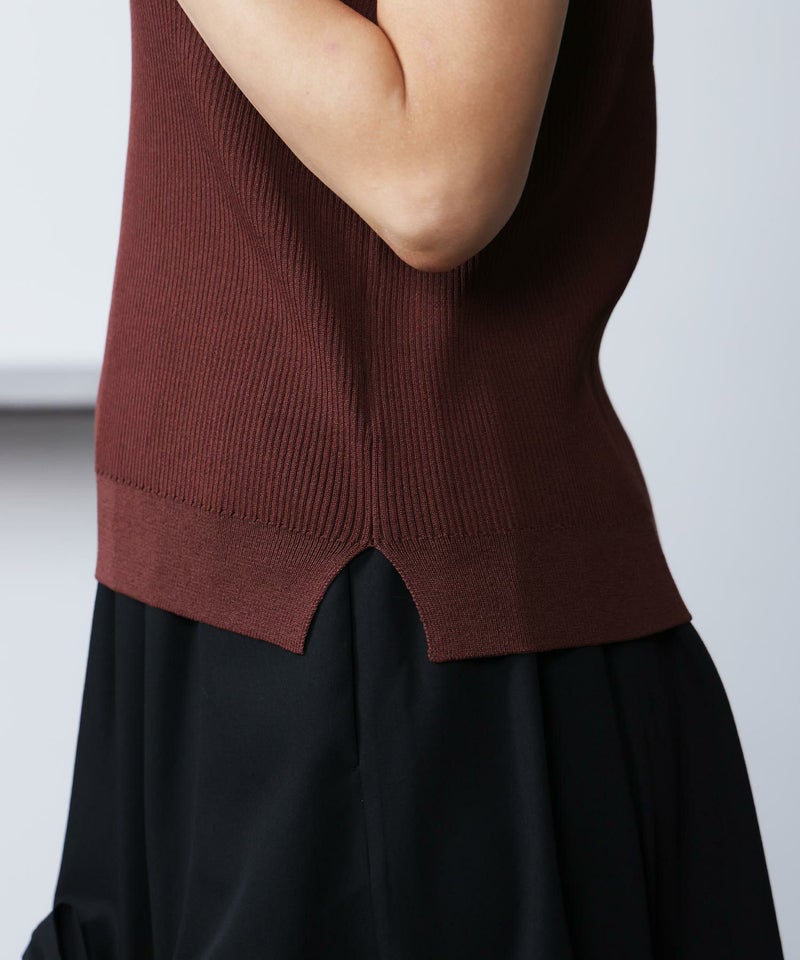 キュっと詰まったクルーネックが上品な印象を与え、ノースリーブでも肌見せし過ぎず、すっきりとしたバランスに。