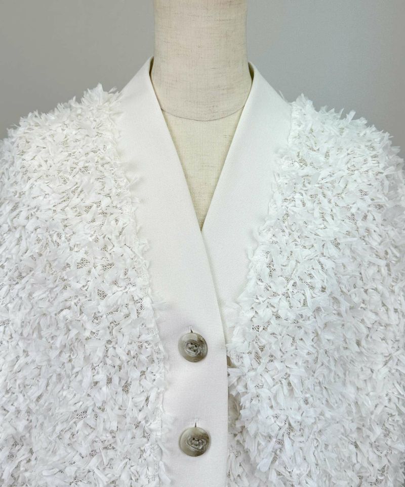 大きめボタンのV開きと、半袖ドルマン風のゆったりシルエットが、ほどよい抜け感と上品さを演出します。