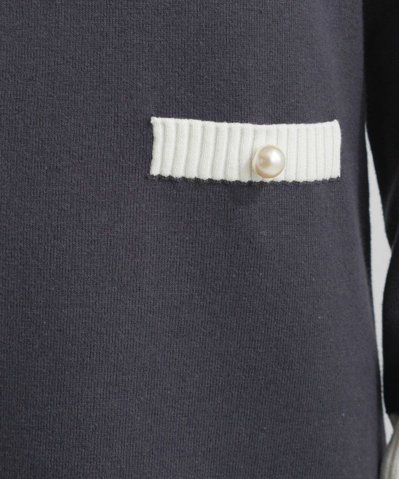 襟ぐり、袖口、フェイクポケットに配色リブやパールを配し華やかさをプラス。