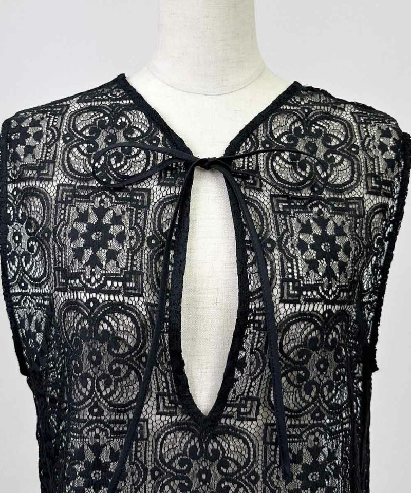 ストンとしたシルエットに襟まわりがVネック&リボンですっきりとしたデザインに。