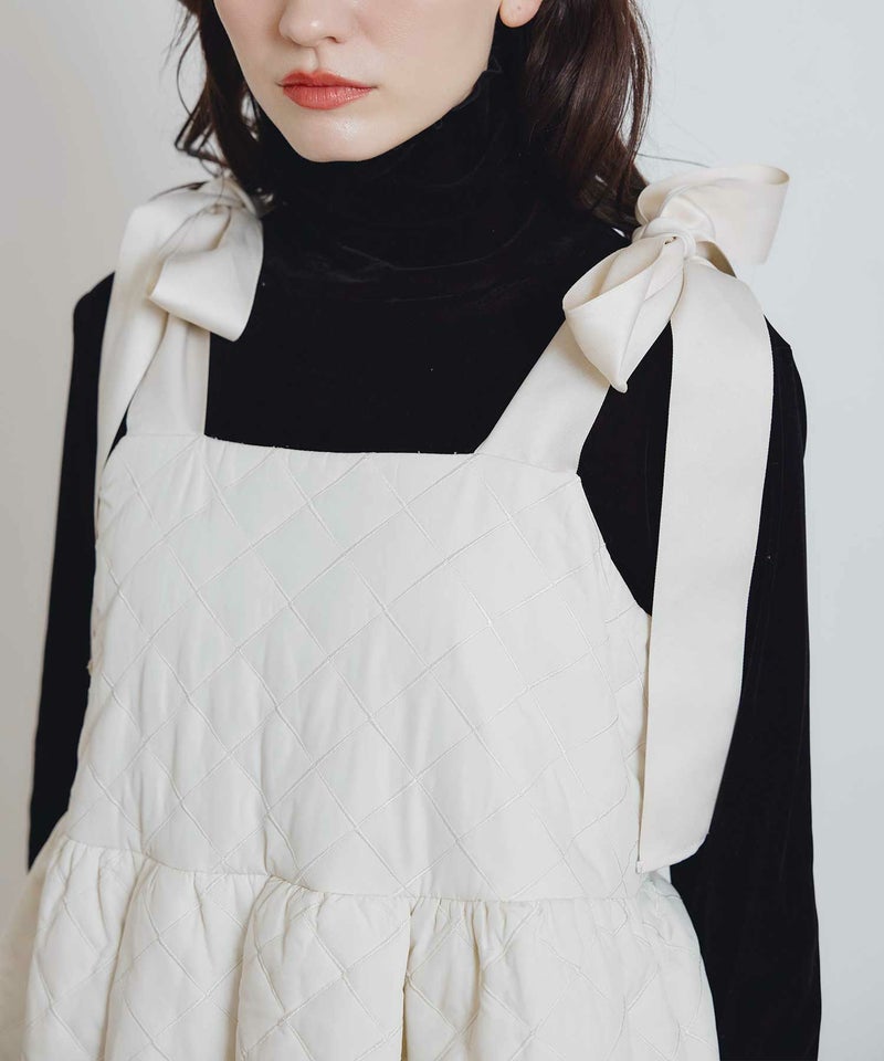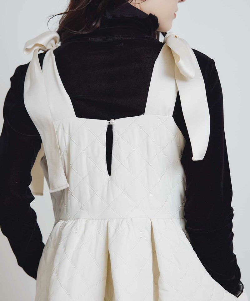 太めのストラップには、同色のサテンリボンをあしらい、肩に結ぶだけで可愛らしさと品のある華やかさをプラス。
