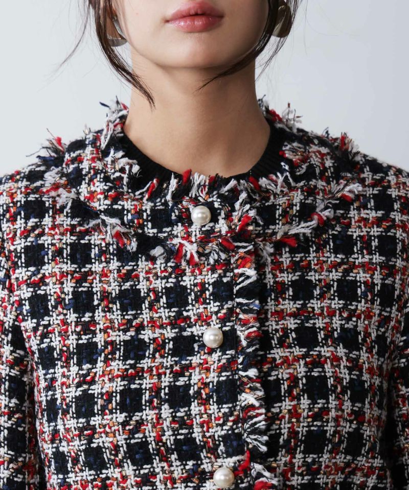 上品エレガントな雰囲気漂うツイードのノーカラージャケット