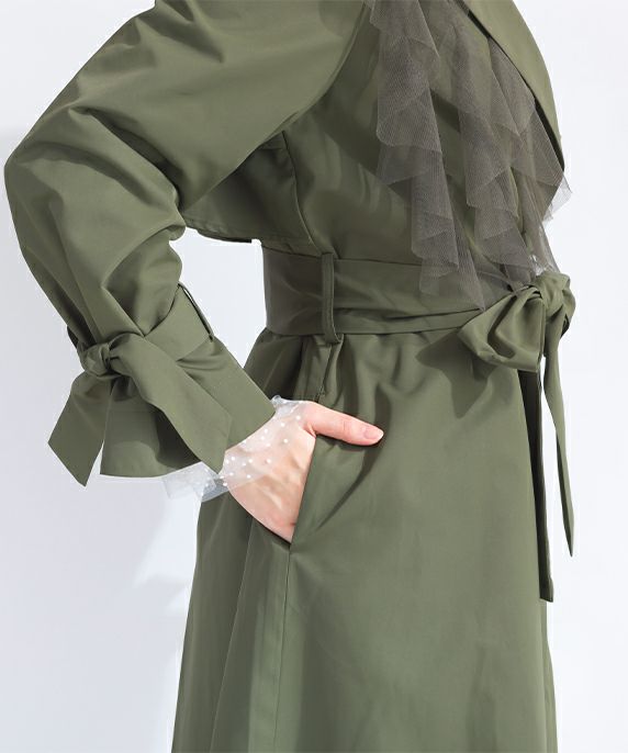 付属のウエストリボンを締めて、より女性らしいメリハリを出した着こなしも素敵です。
