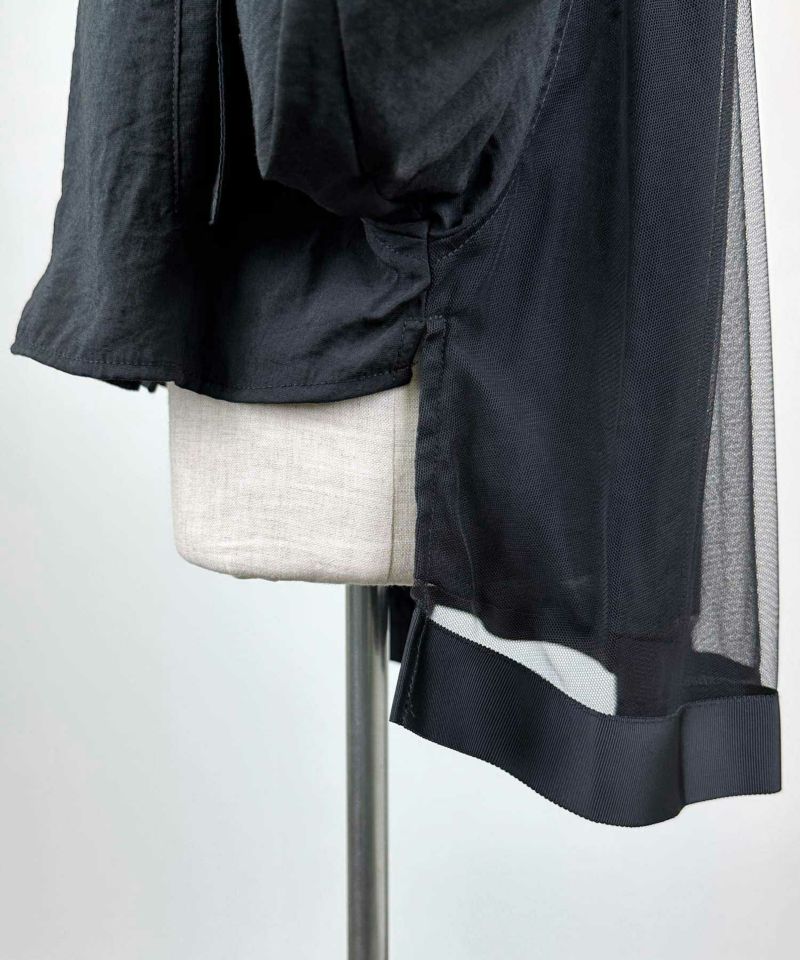 前から見るとミニマルでクール。振り向いたその瞬間、ふわりと揺れるチュールのギャザーが目を惹きます。