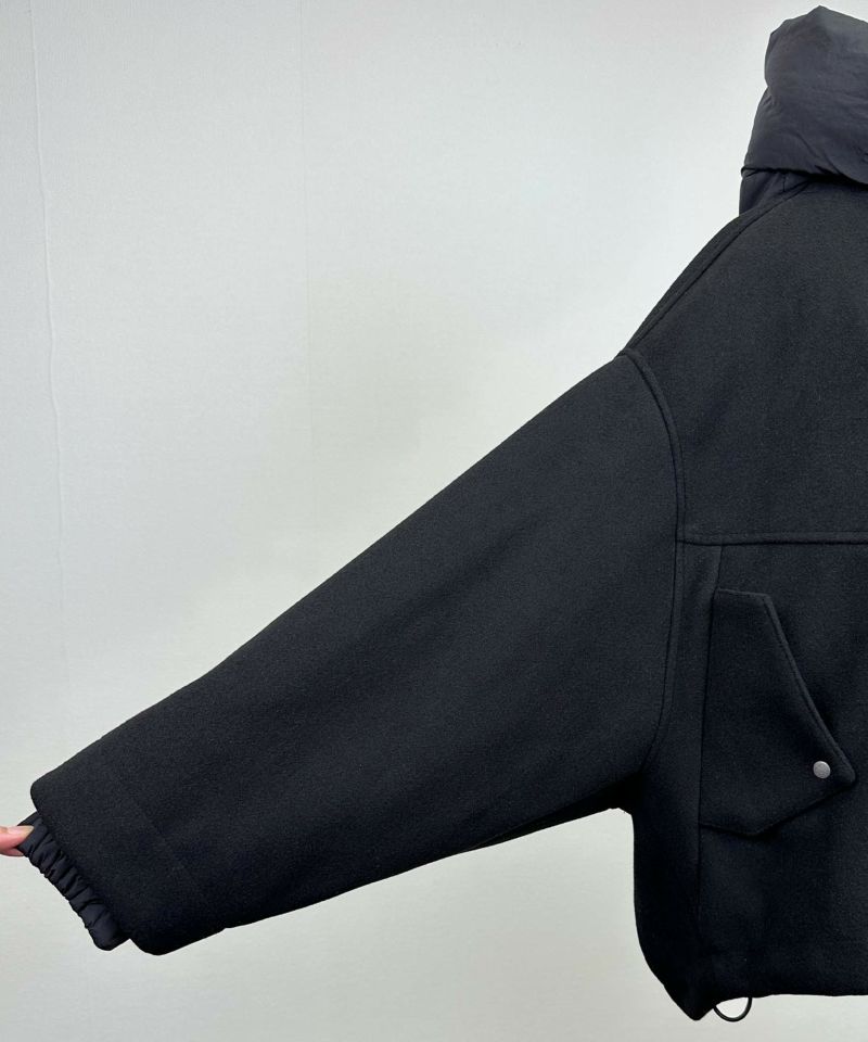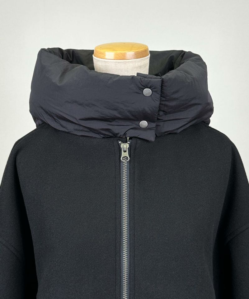 袖口とボリューミーなフードには、中綿入りの異素材を使い、さりげないアクセントとぬくもりをプラス。