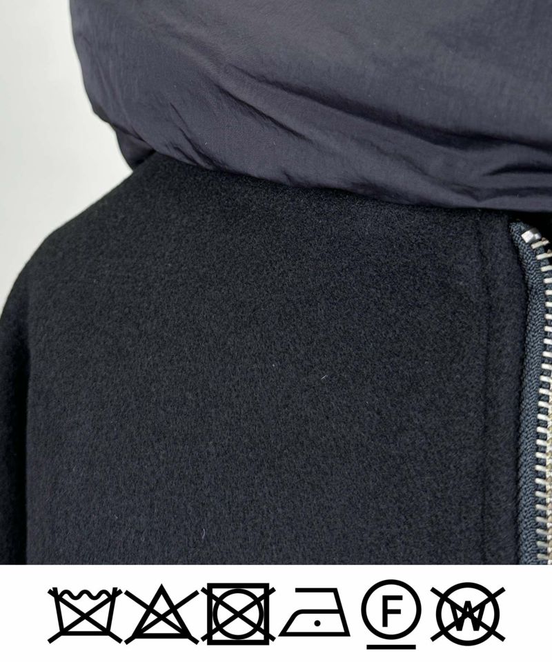 袖口とボリューミーなフードには、中綿入りの異素材を使い、さりげないアクセントとぬくもりをプラス。