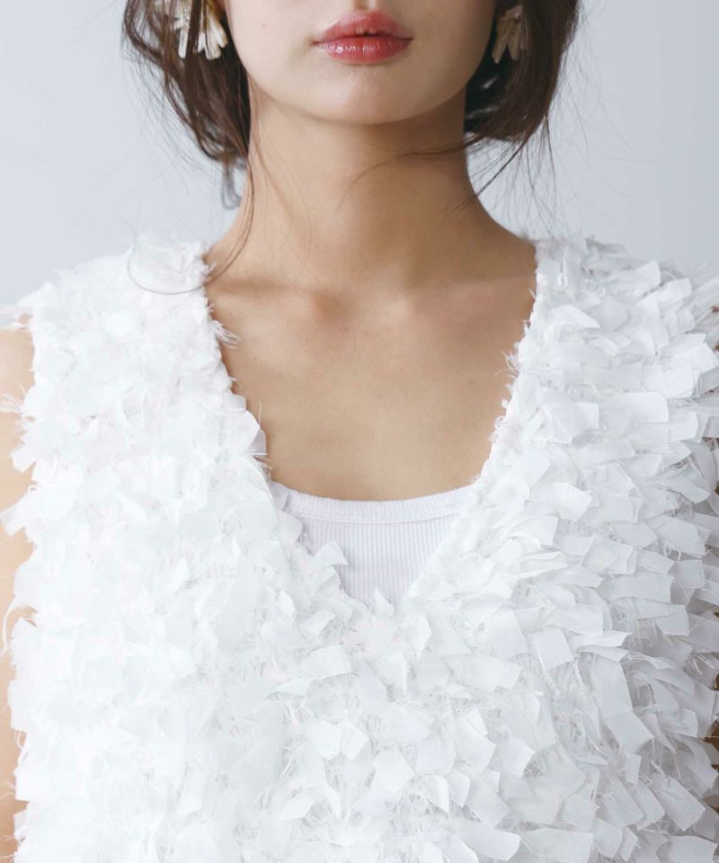 カジュアルなアイテムながらもリボンフリンジを全体に施す事で、フェミニンで表情豊かなデザインに。