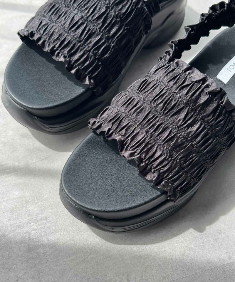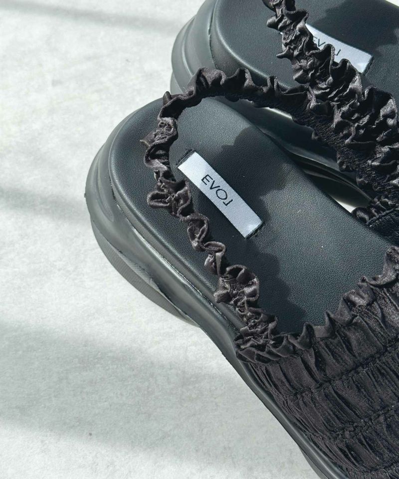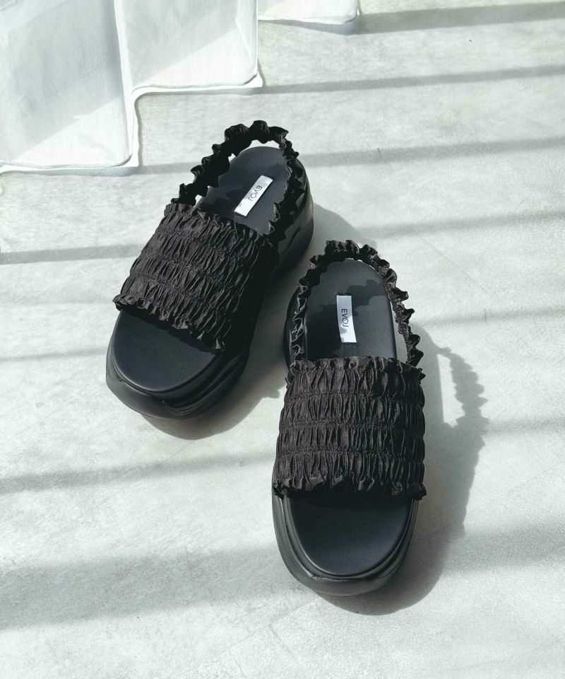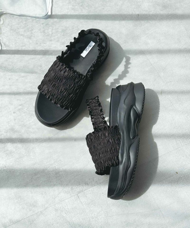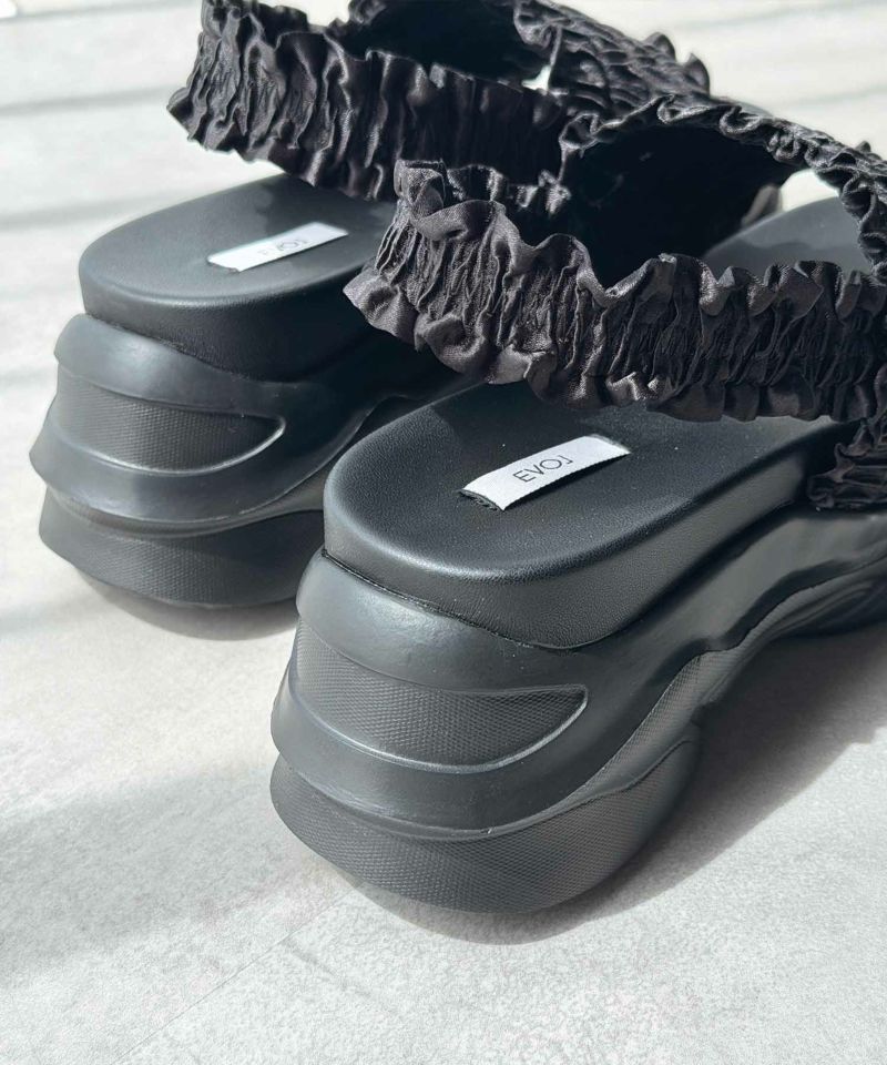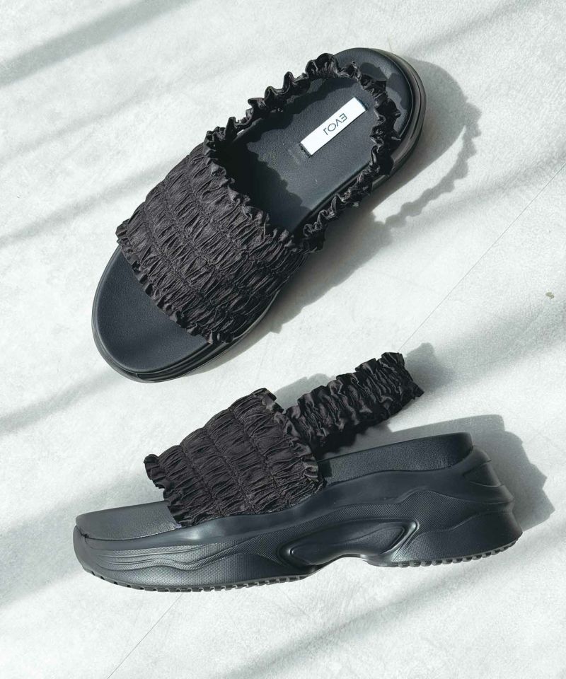 たっぷりのギャザーフリルが夏のコーディネートに華やかさをプラスする厚底スポーツサンダル。