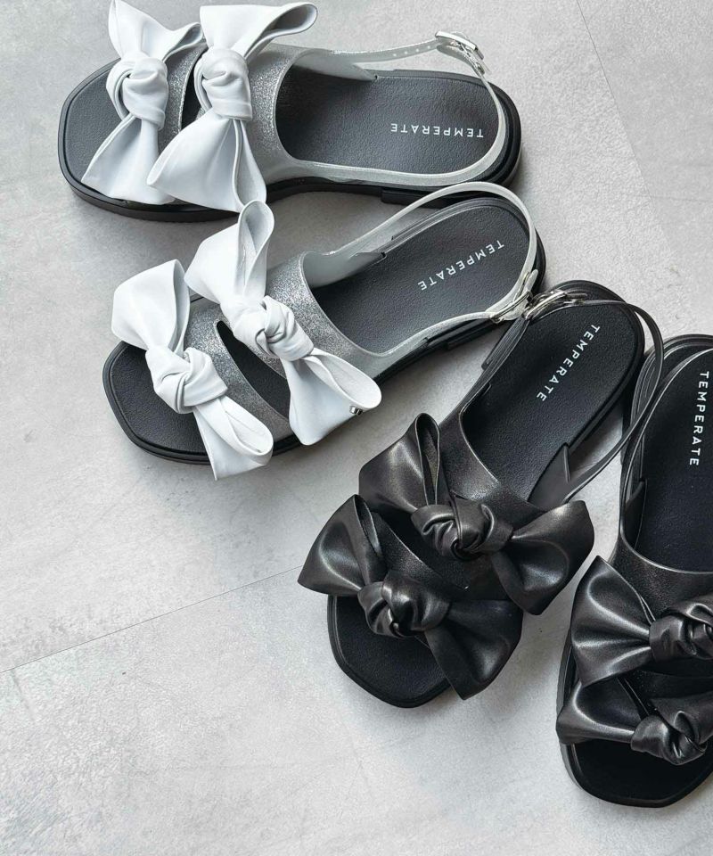 クシュっと大きなダブルリボンで足元が華やぐサンダル。