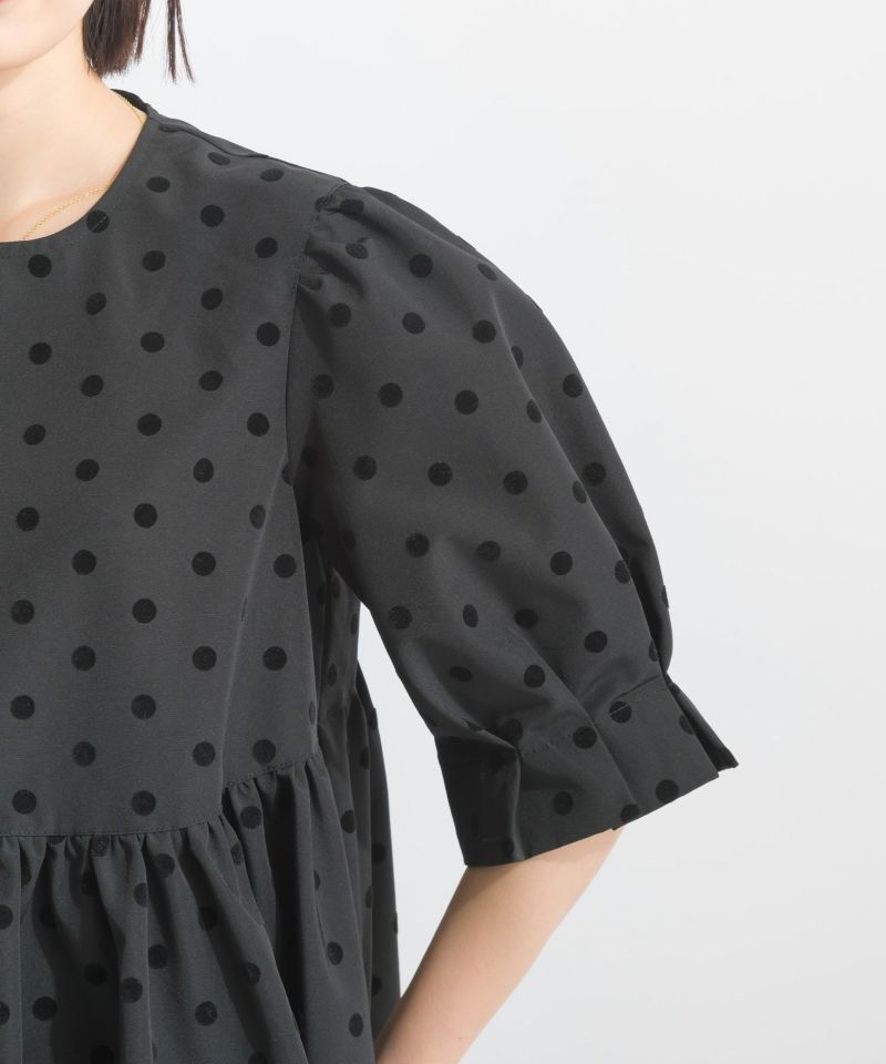 【セットアップ可能】フロッキードットペプラム五分袖ブラウス