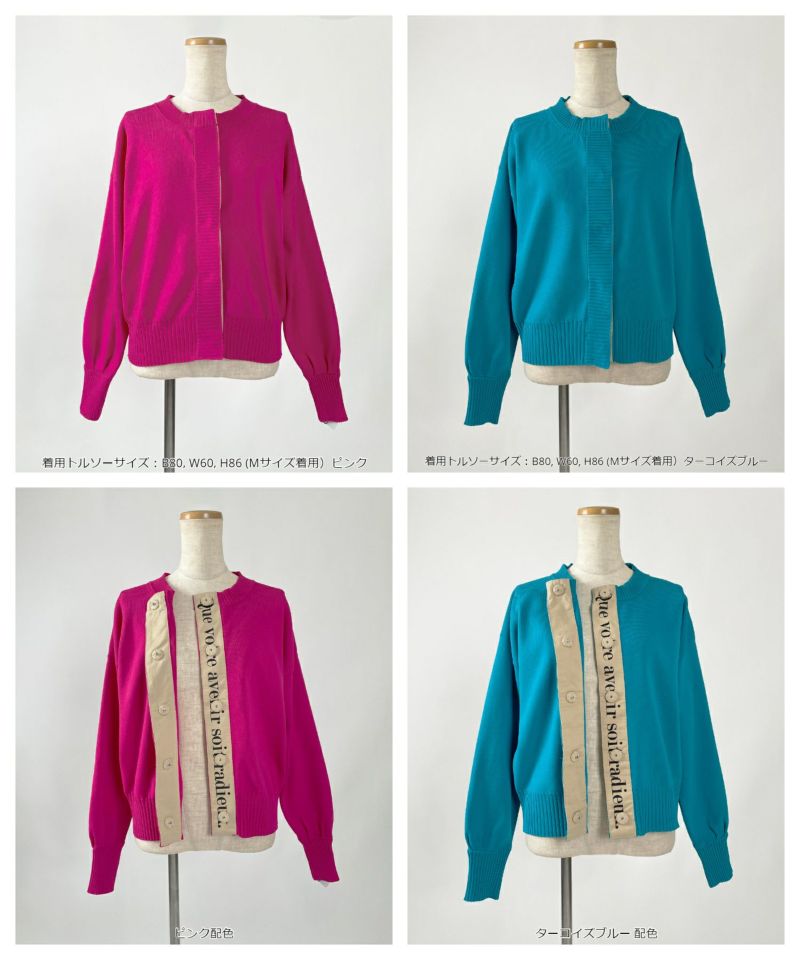 前立て部分にテキスト入り配色テープを配したカーディガン。