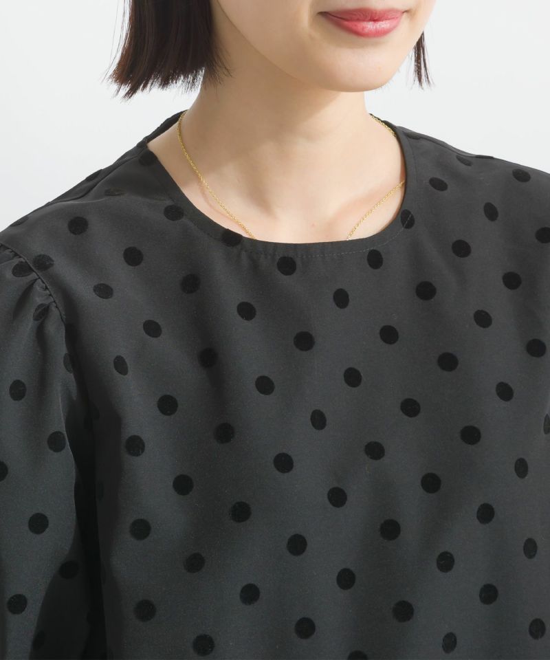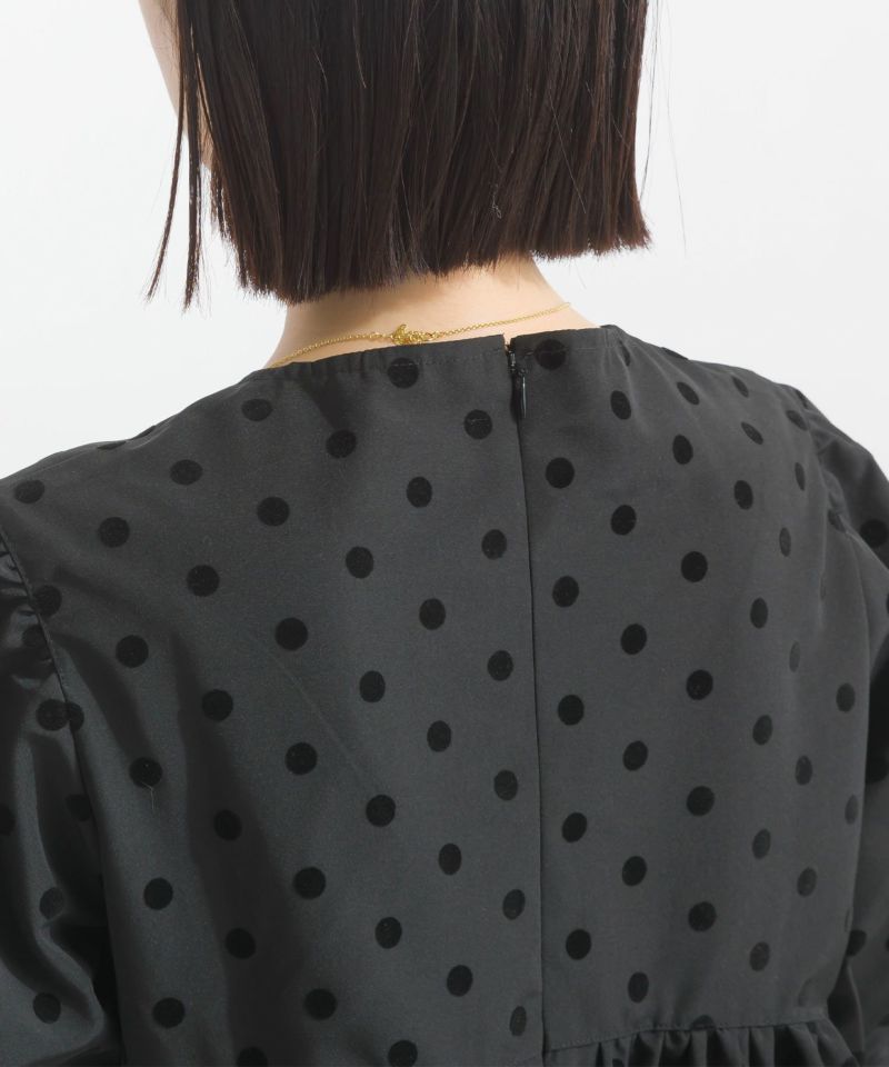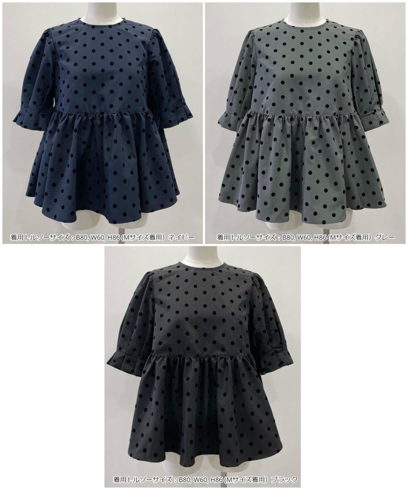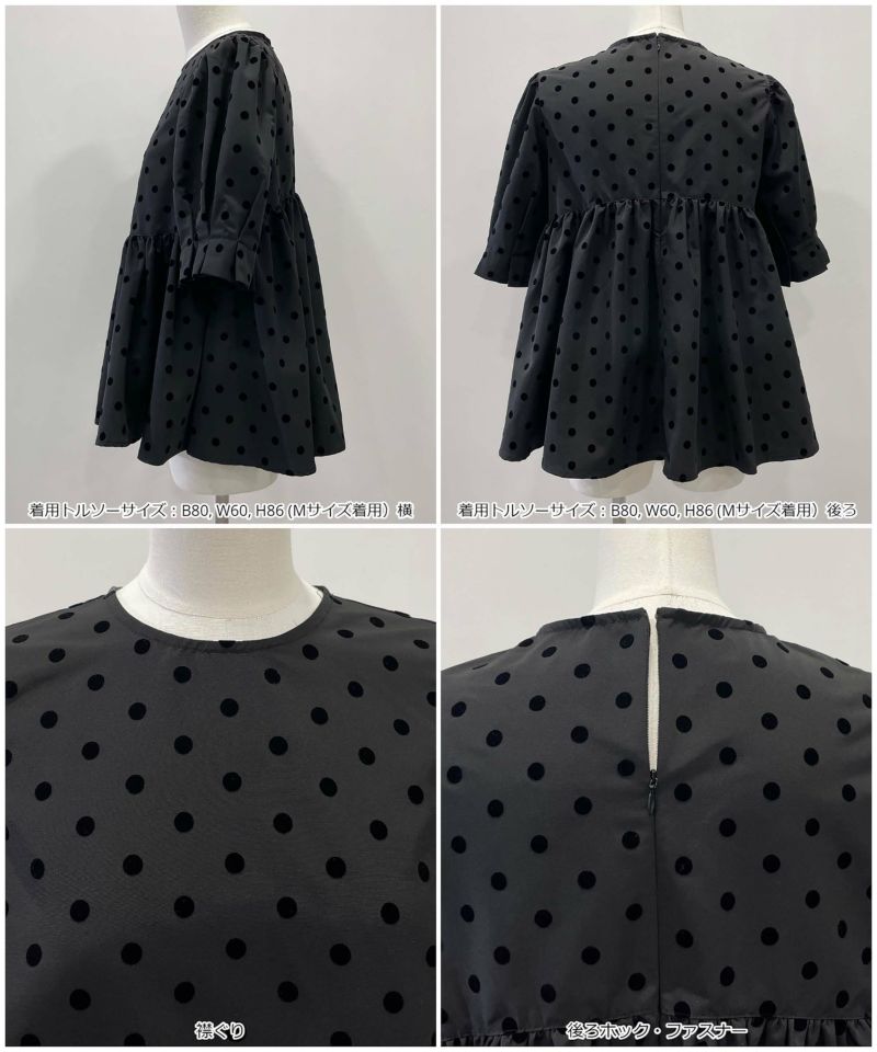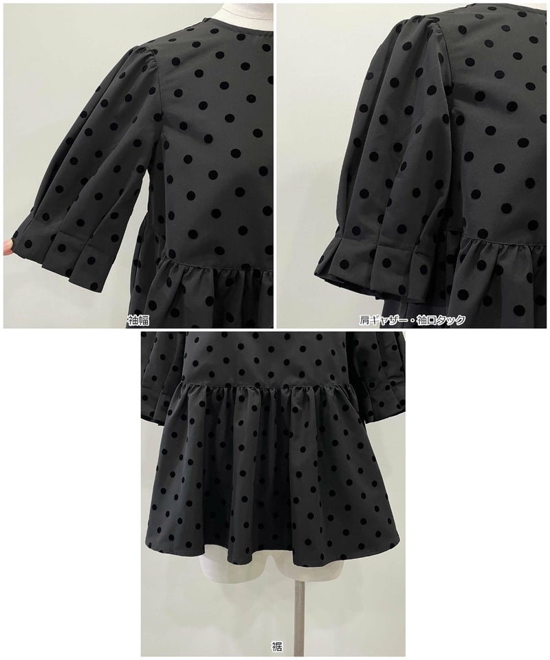 【セットアップ可能】フロッキードットペプラム五分袖ブラウス