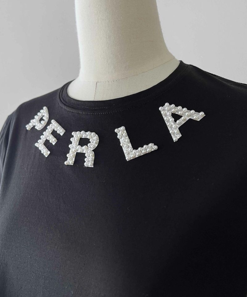 フロントのパールビーズ「PERLA」のロゴがポイントのTシャツ。