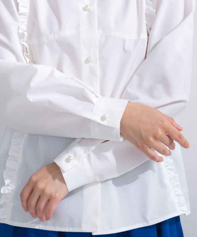 フロントと袖口にはパールボタンでエレガントさをプラス。