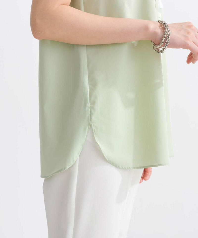 バンドカラー+ノースリーブのすっきりシルエットに、