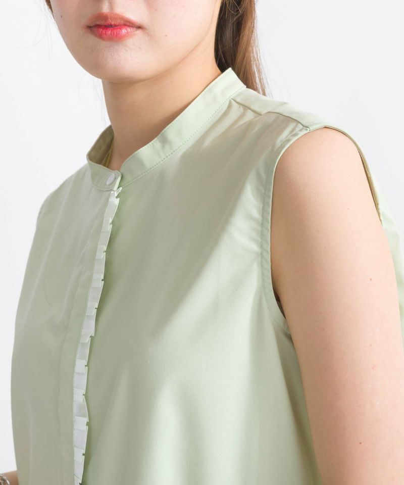 バンドカラー+ノースリーブのすっきりシルエットに、