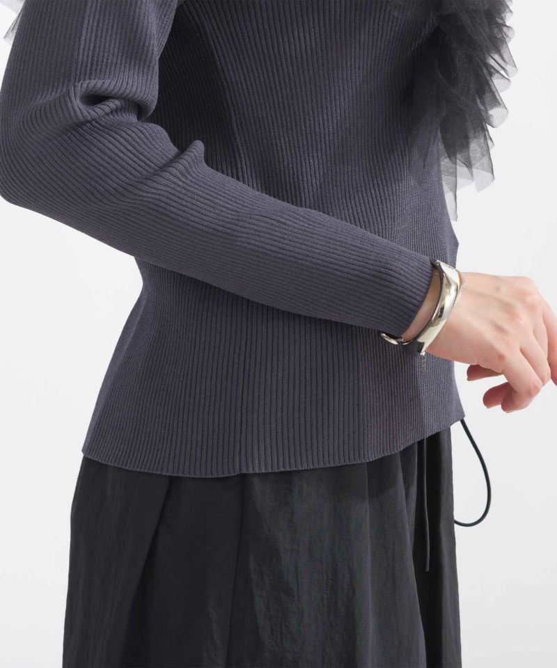 シンプルなリブニットにランダムなチュールフリルを配し、