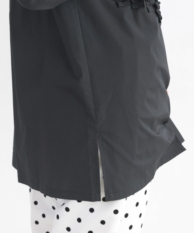 フロントにたっぷりのフリルを配し、華やかで存在感のある一枚に仕上げました。