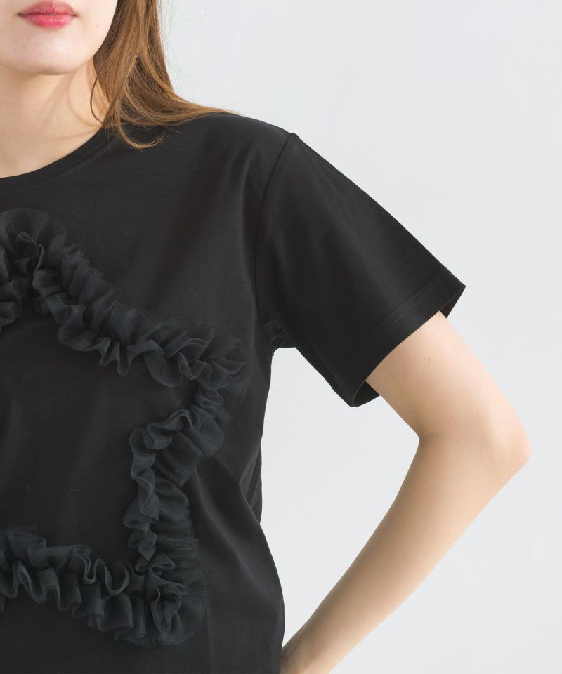 シンプルなTシャツに星型のチュールを施し、立体感と存在感をプラス。
