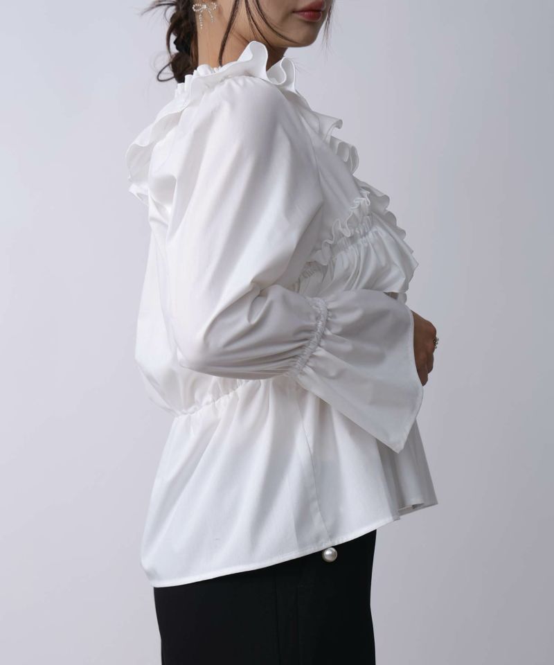 ふんわりと広がる贅沢フリルに、ウエストと袖に入ったゴムギャザーで、より女性らしいシルエットに。